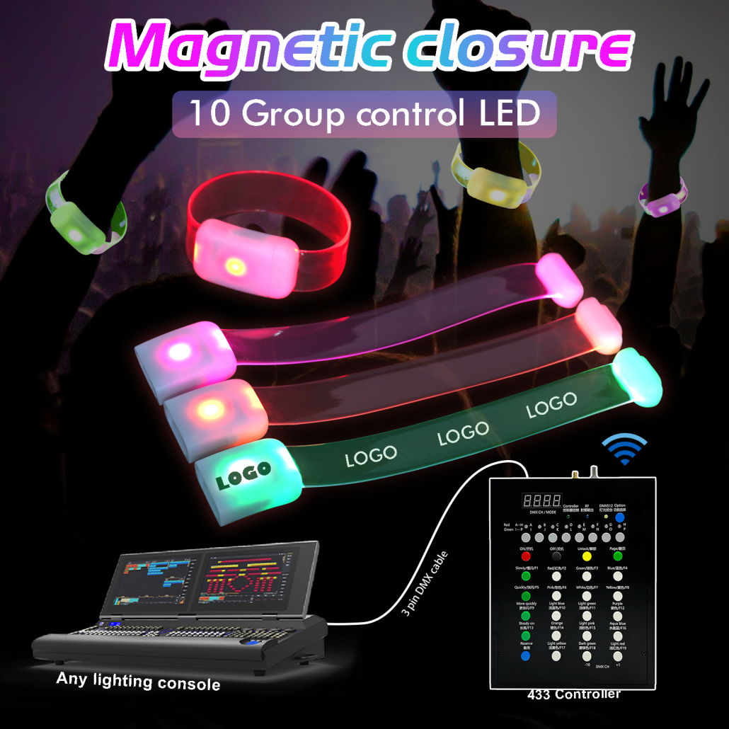 Light up your crowd in style with our innovative magnetic TPU wristbands! Unlike ordinary LED bands, our advanced design makes the entire strap glow uniformly, creating a breathtaking 360° halo effect that dazzles from every angle. Control the magic wirelessly via DMX for perfectly synchronized light shows that transform crowds into radiant displays.