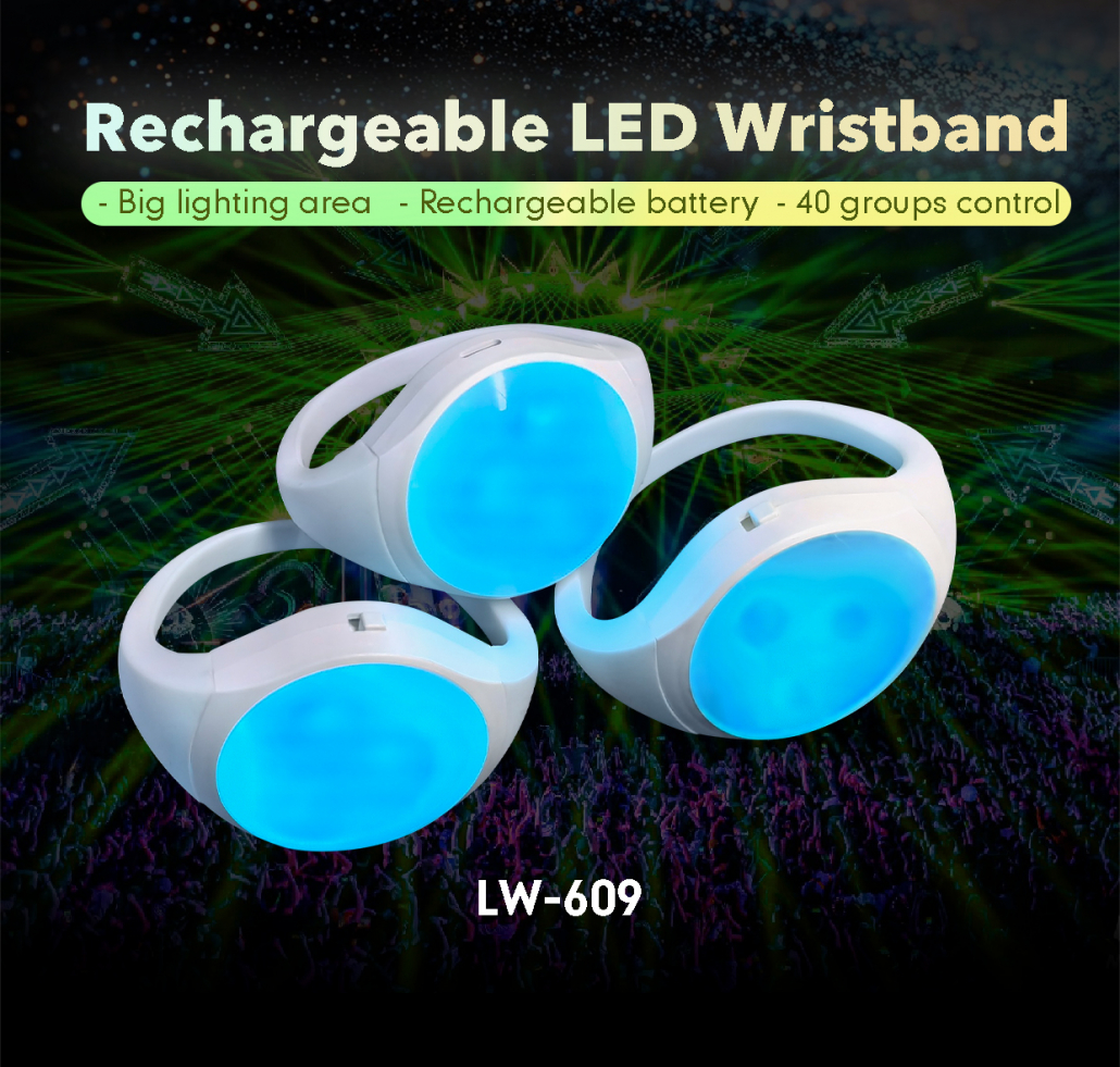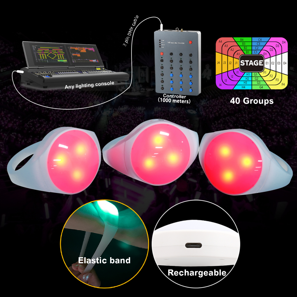 Super Concert wristband, a cutting-edge LED wristband designed for immersive crowd experiences. Featuring a distinctive tri-cluster LED design, this professional-grade wearable offers versatile DMX console control (1000m range) with 40 programmable groups, and Bluetooth remote control, for fully customizable light shows.