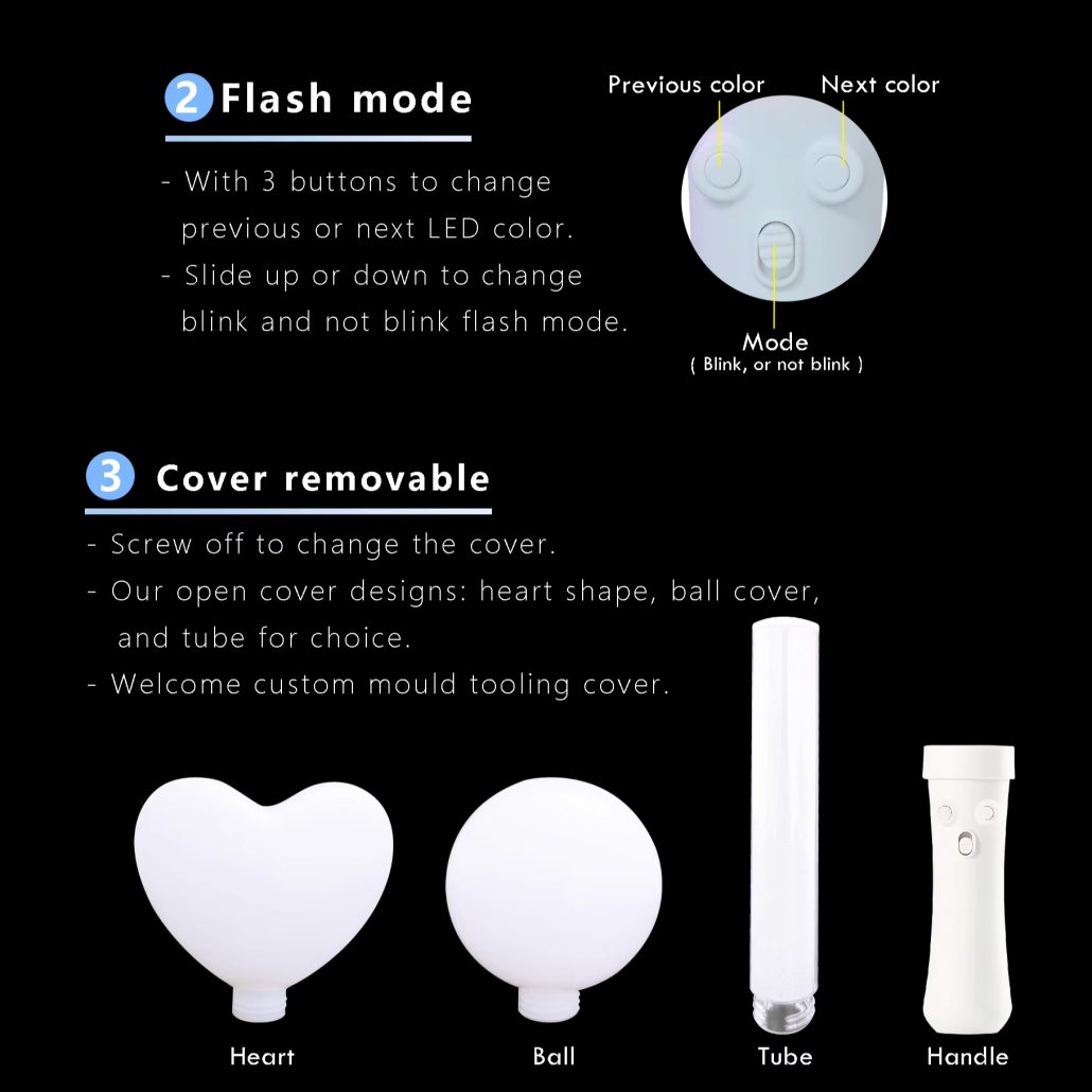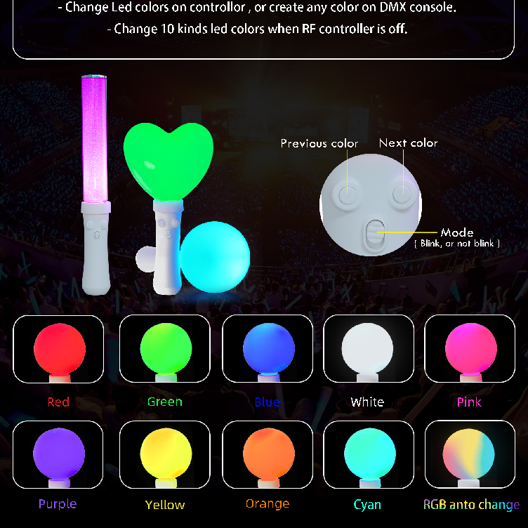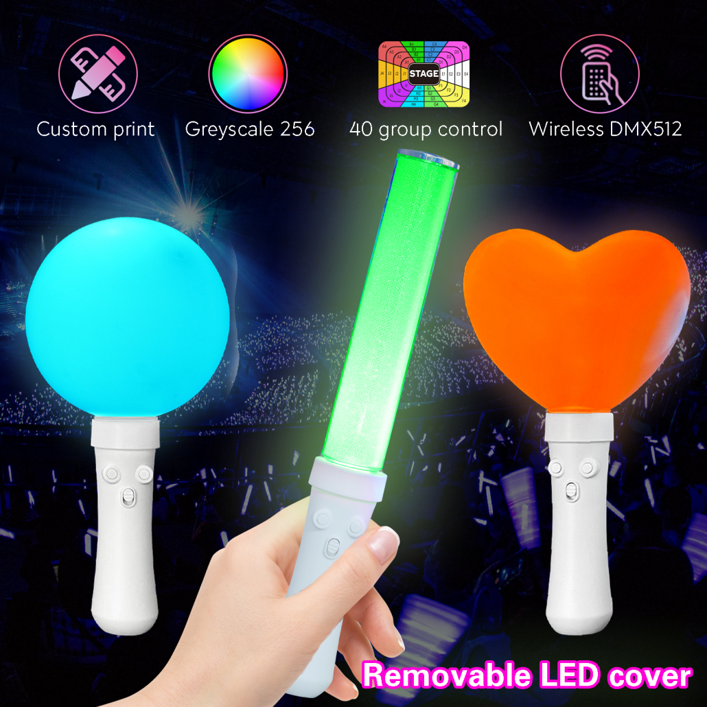Unique design, heart shaped, ball-shaped glowing stick! The light stick is an important carrier for connecting the heart of fans and idols. It’s not just a glowing decoration. 40 zones control allow you to immerse yourself in the event and concert. We offer full customization, design customization, and sample customization with private molds and product certification.
