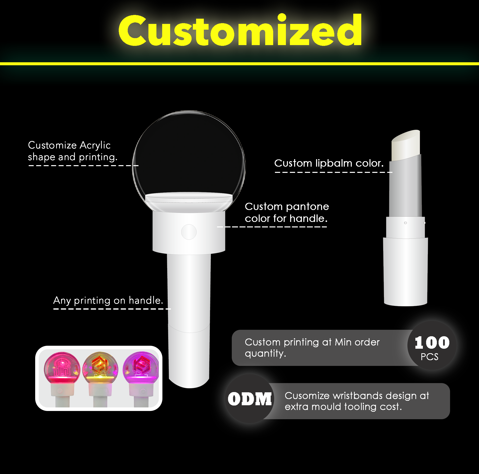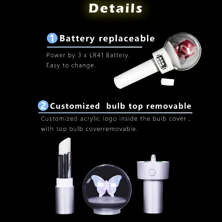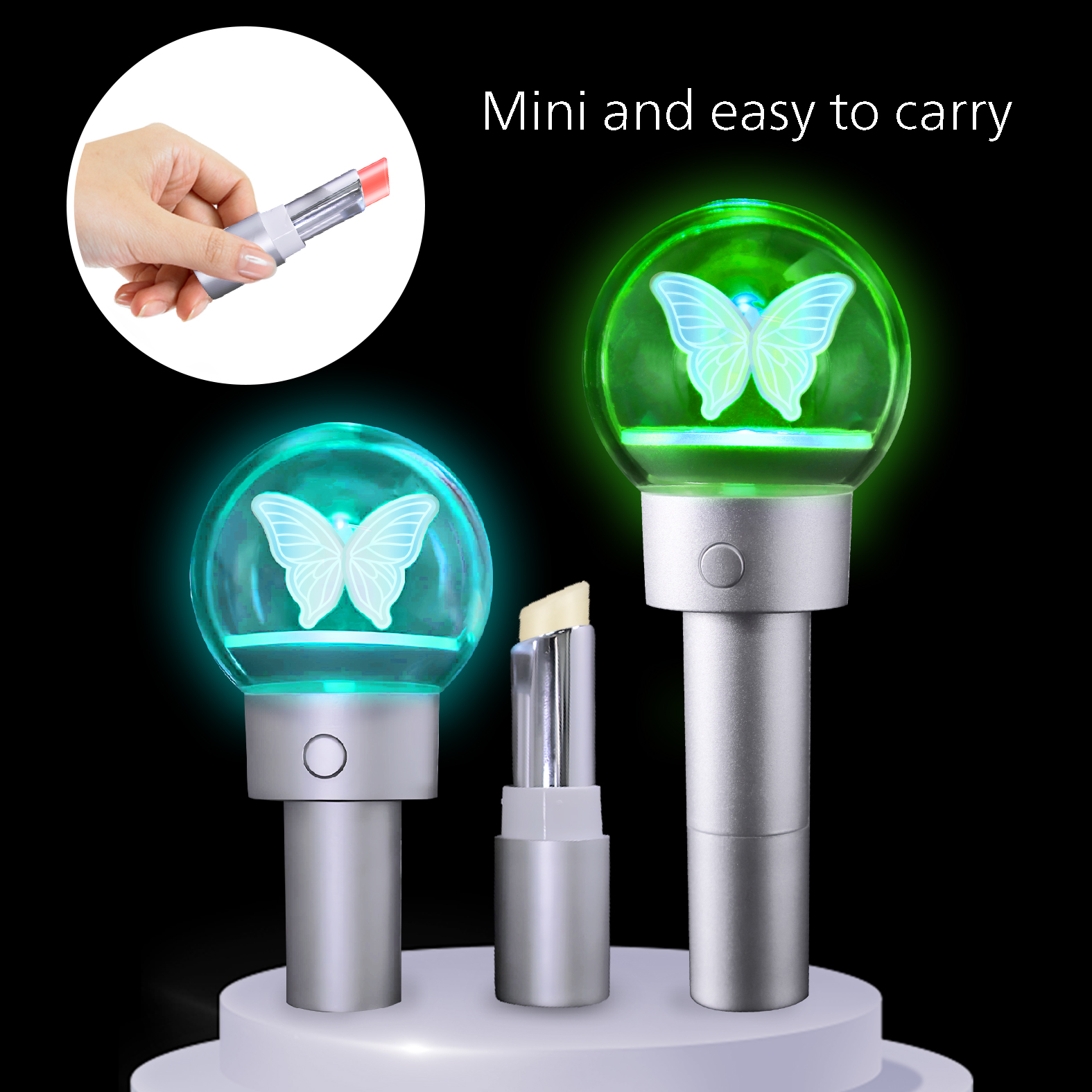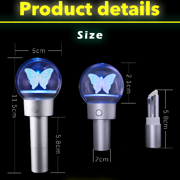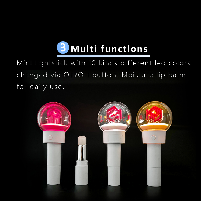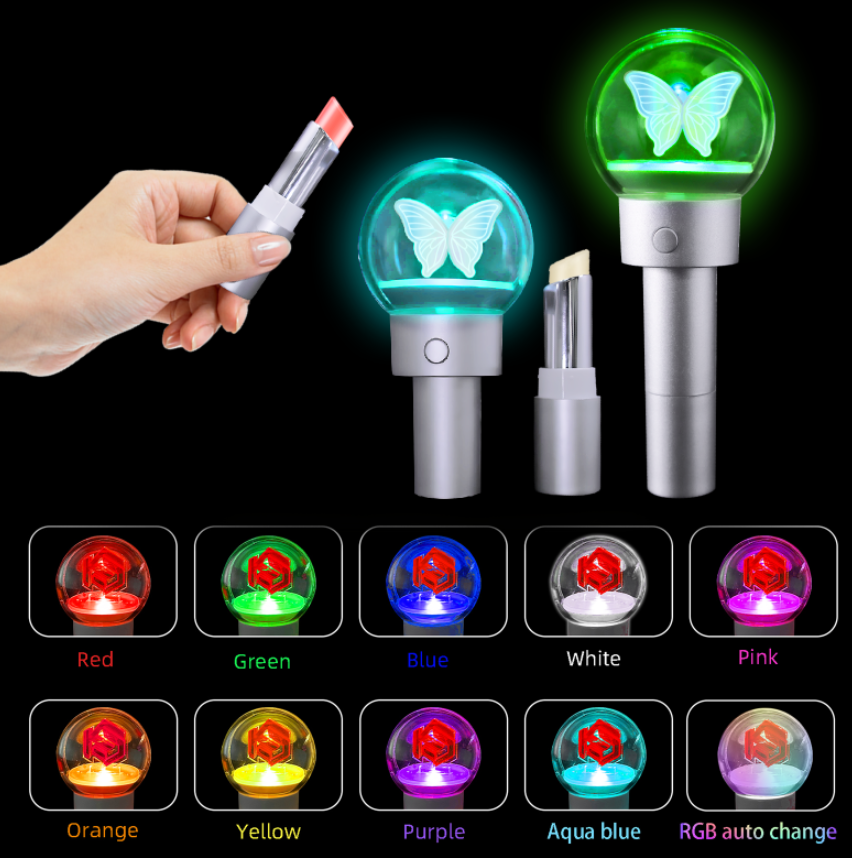 Where lipstick meets glow stick, blends functionality with fun. The top features a transparent acrylic sphere with customizable LED panels (text, patterns, or logos), while the bottom houses a moisturizing lip balm or pigmented lipstick.