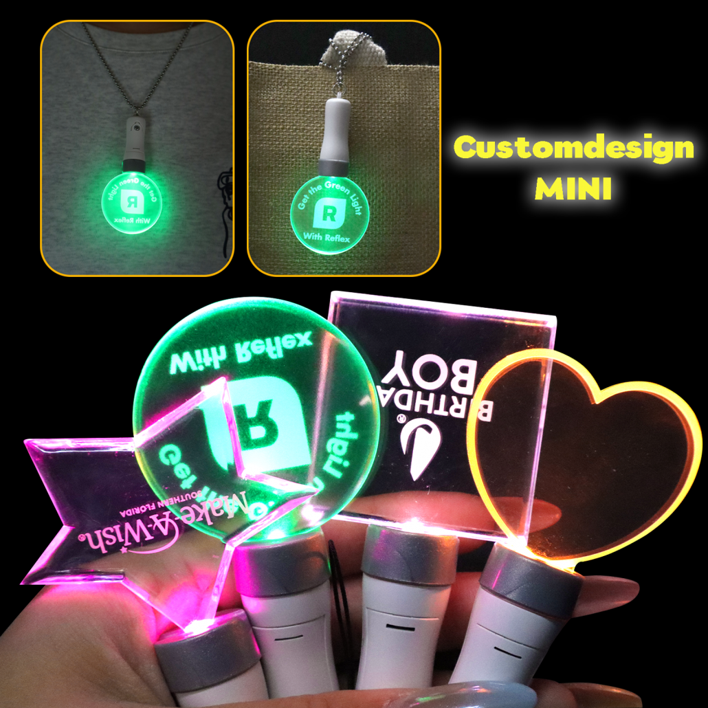 Our mini keychain light stick is mini finger size and convenient, and can be used in various scenarios: Led pendant for necklace, Keychain on handbag, Keys torch, Backpack torch, Promotion capsule toy. Support customized printing, RGB multi colors. It is a new popular trend to choose lightsticks.